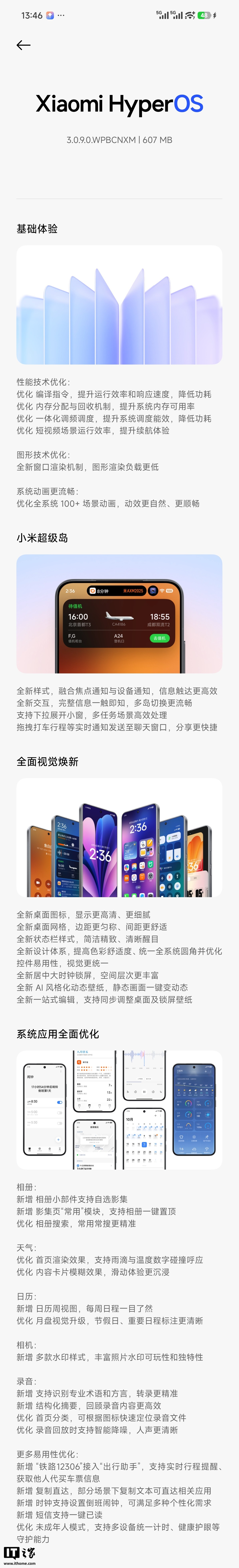 优化全系统 100 + 场景动画,动效更自然、更顺畅小米超级岛全新样式,融合焦点通知与设备通知,信息触达更高效全新交互,完整信息一触即知,多岛切换更流畅支持下拉展开小窗,多任务场景高效处理拖拽打车行程等实时通知发送至聊天窗口,分享更快捷全面视觉焕新全新桌面图标,显示更高清、更细腻全新桌面网格,边距更匀称、间距更舒适全新状态栏样式,简洁精致、清晰醒目全新设计体系,提高色彩舒适度、统一全系统圆角并优化控件易用性,视觉更统一全新居中大时钟锁屏,空间层次更丰富全新 AI 风格化动态壁纸,静态画面一键变动态全新一站式编辑,支持同步调整桌面及锁屏壁纸系统应用全面优化相册: