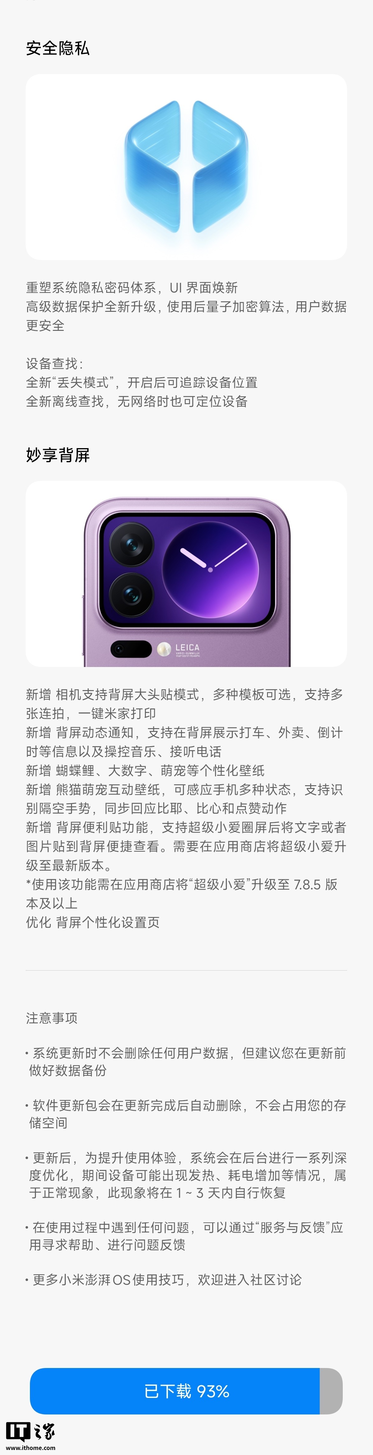 支持通过小米平板指纹或密码快速解锁小米手机支持通过小米汽车人脸识别快速解锁小米手机支持通过 iPhone、iPad、Mac 的触控 ID、面容 ID 及密码,快速解锁小米手机安全隐私重塑系统隐私密码体系,UI 界面焕新高级数据保护全新升级,使用后量子加密算法,用户数据更安全设备查找:全新“丢失模式”,开启后可追踪设备位置;全新离线查找,无网络时也可定位设备妙享背屏新增相机支持背屏大头贴模式,多种模板可选,支持多张连拍,一键米家打印新增背屏动态通知,支持在背屏展示打车、外卖、倒计时等信息以及操控音乐、接听电话新增蝴蝶鲤、大数字、萌宠等个性化壁纸新增熊猫萌宠互动壁纸,可感应手机多种状态,支持识别隔空手势,同步回应比耶、比心和点赞动作新增背屏便利贴功能,支持超级小爱圈屏后将文字或者图片贴到背屏便捷查看。需要在应用商店将超级小爱升级至最新版本。优化背屏个性化设置页