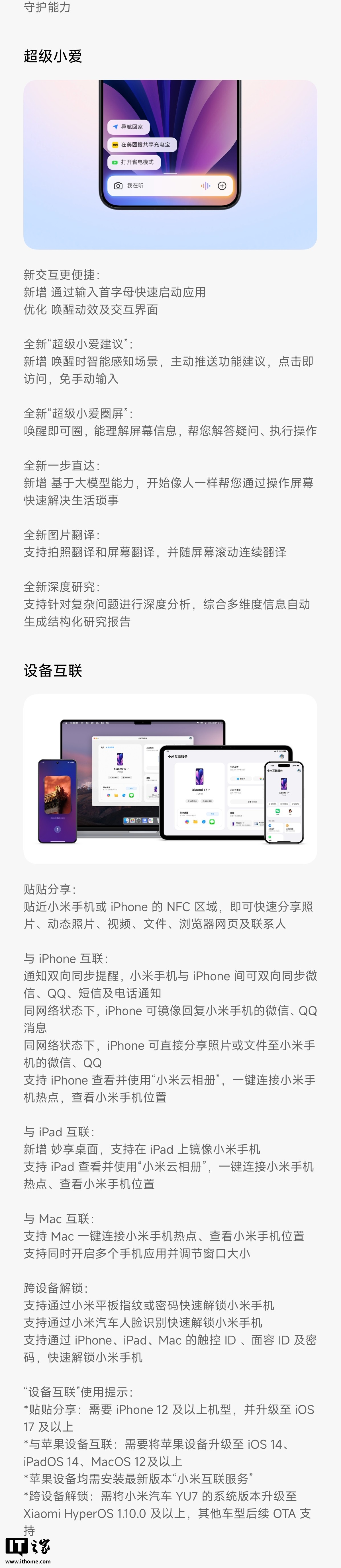 新增“铁路 12306”接入“出行助手”,支持实时行程提醒、获取他人代买车票信息新增复制直达,部分场景下复制文本可直达相关应用新增时钟支持设置倒班闹钟,可满足多种个性化需求新增短信支持一键已读优化未成年人模式,支持多设备统一计时、健康护眼等守护能力超级小爱新交互更便捷:新增通过输入首字母快速启动应用;优化唤醒动效及交互界面全新“超级小爱建议”:新增唤醒时智能感知场景,主动推送功能建议,点击即访问,免手动输入全新“超级小爱圈屏”:唤醒即可圈,能理解屏幕信息,帮您解答疑问、执行操作全新一步直达:新增基于大模型能力,开始像人一样帮您通过操作屏幕快速解决生活琐事全新图片翻译:支持拍照翻译和屏幕翻译,并随屏幕滚动连续翻译全新深度研究:支持针对复杂问题进行深度分析,综合多维度信息自动生成结构化研究报告设备互联贴贴分享: